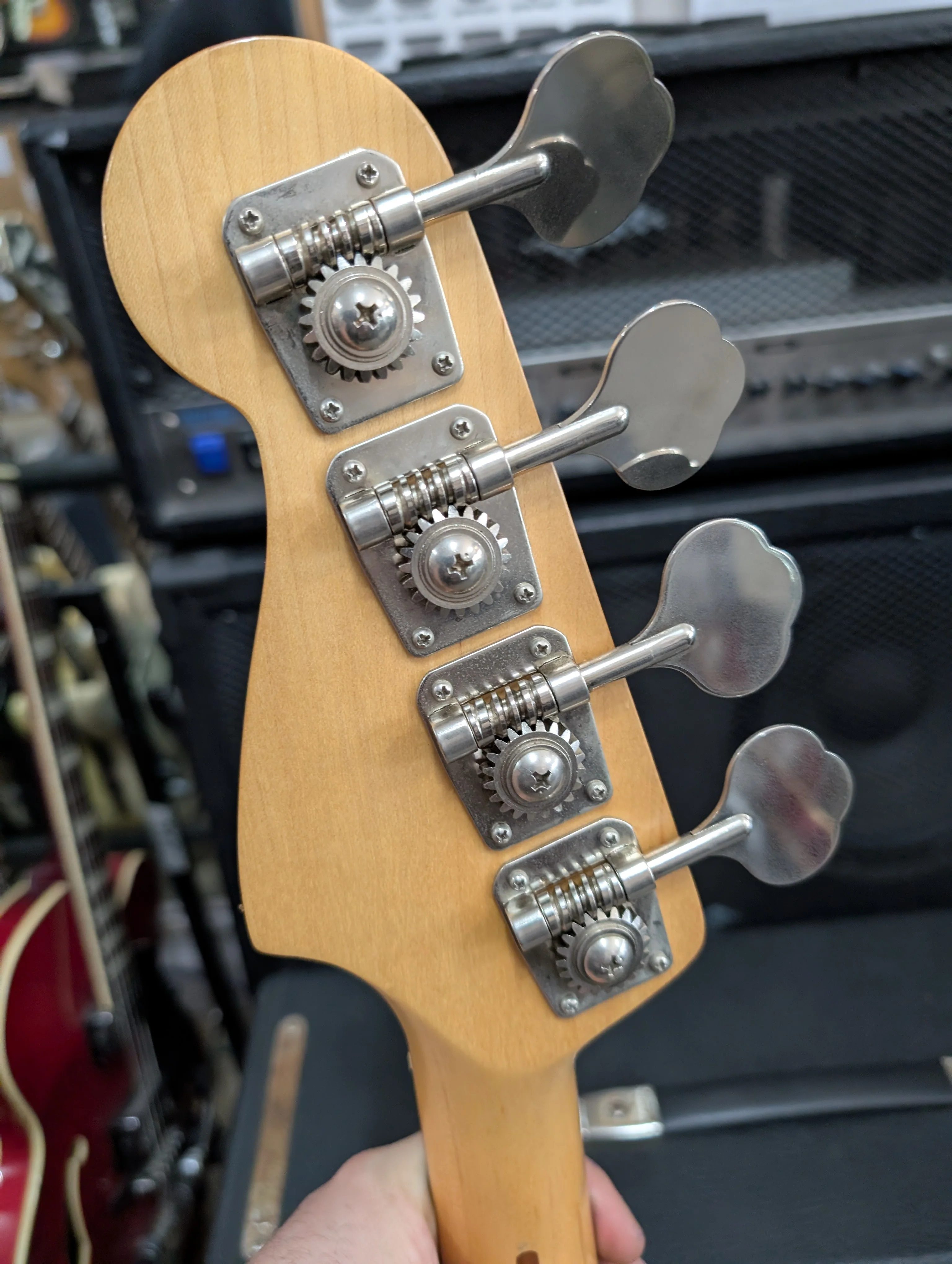 Made in Japan, 2004-2005. Standard P-bass. With paw-print inlay stickers and a cat to top it off. Meow meow meow.
