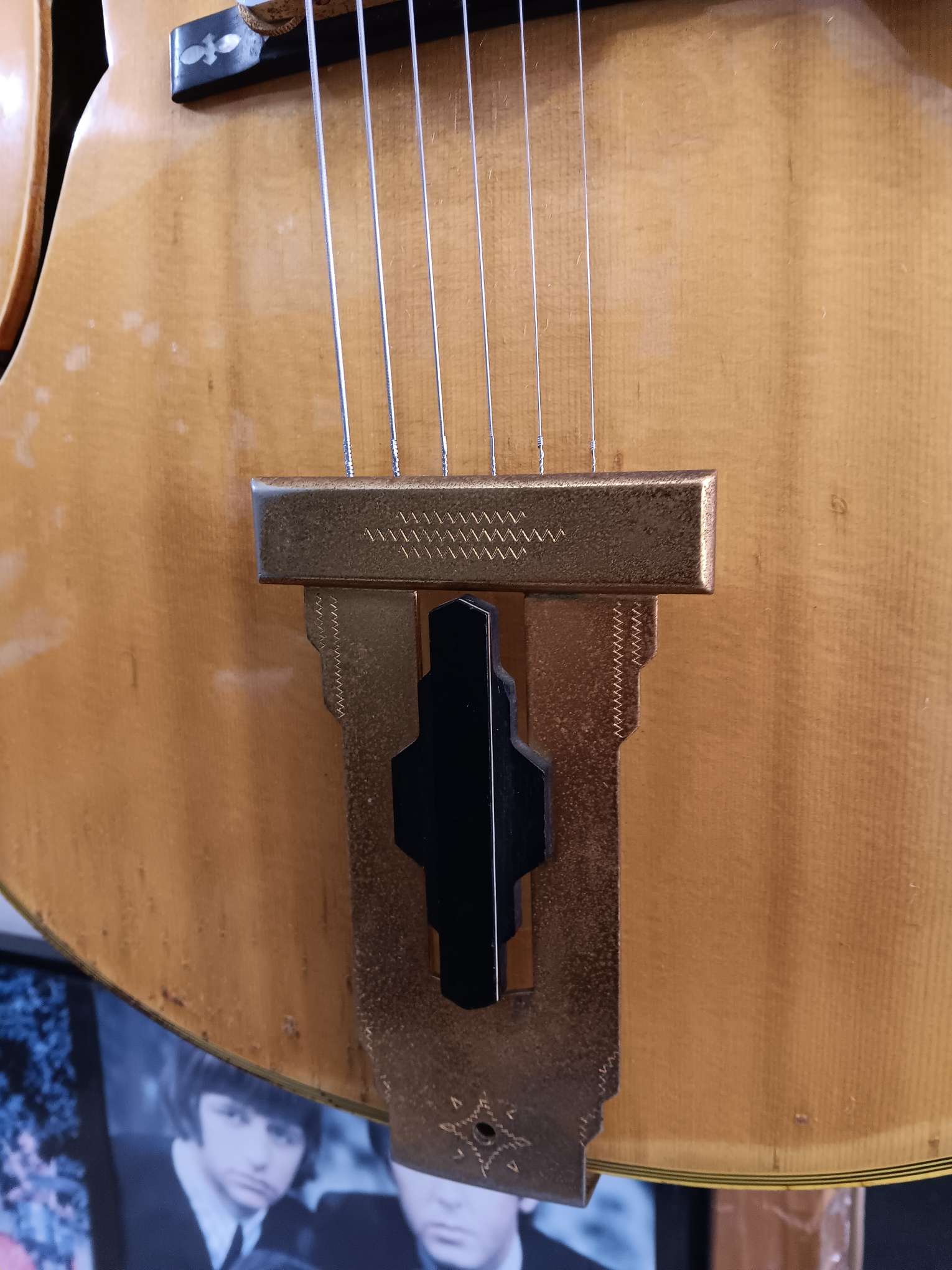 Made in Japan - Nice copy of a Gibson Johnny Smtih. Natural finish, Spruce top with maple back and sides, Bound stripped ebony finger board. Original pickups and wiring harness mounted on the guard. Binding is damaged and started to roach in some areas, this seems stable and not falling off. Looks to be all the original bits, gold plating has some off the bridge but looks to be Greco. Original Maxon pickups. Strung with a set of flats. w/ case