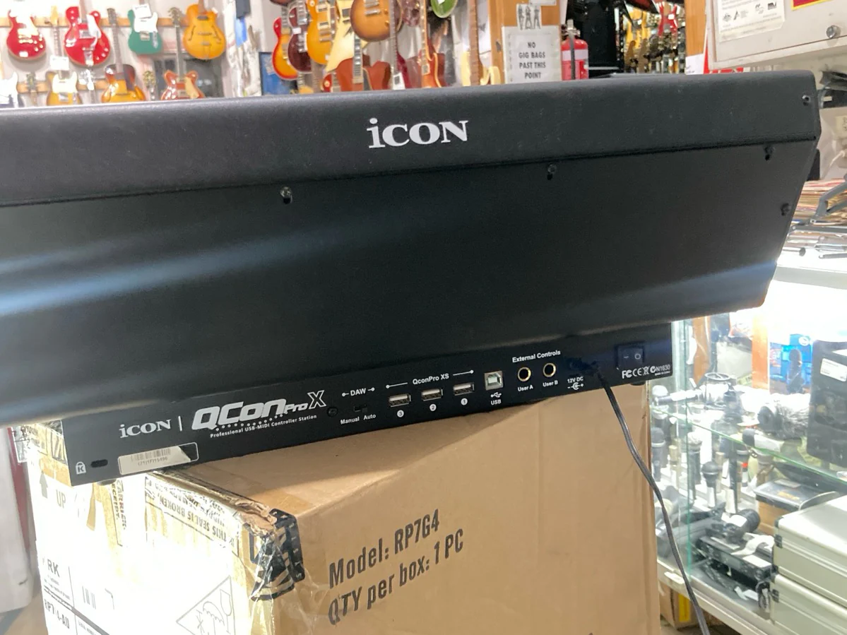 ICON Qcon Pro X DAW USB MIDI Control Surface, tactile control via USB2.0, nine full sized motorized faders, eight rotary dual-function encoders, two large backlit LCD screens, LED volume metering, and jog wheel. Compatible with most DAWs. No power supply included but we sell them for $20