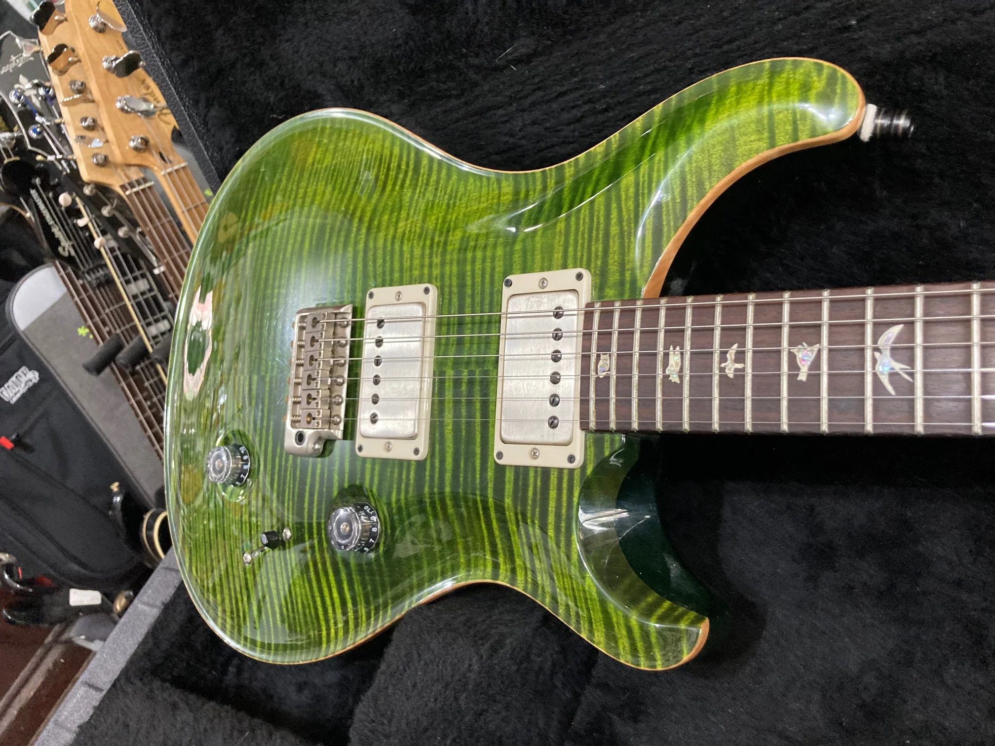 Made in USA. 2013. AMAZING! In rare Jade Green. Only minor fret wear. Overall very good condition. Brush-stroke birds inlays. Bare knuckle humbucker pickups. 5-Way Pickup Switch. PRS Tremolo Bridge. PRS Locking Tuners w/ OHSC