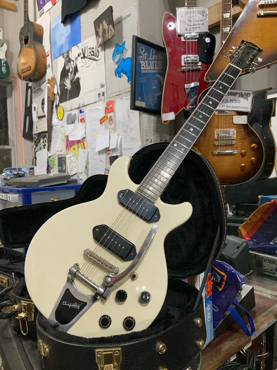 Warmoth Les Paul Special Double Cut - Features a Bound Birdseye / Spalted Maple Neck with Bound Ebony Fingerboard, Bolted on to an relieved / easy access neck heel. Mahogany Body finished in Olympic White. Dual Dog Ear P-90 Pickups with Licensed Bigsby Vibrola (posts for Stop Tail still present). An Absolute Killer Guitar. w/hard case